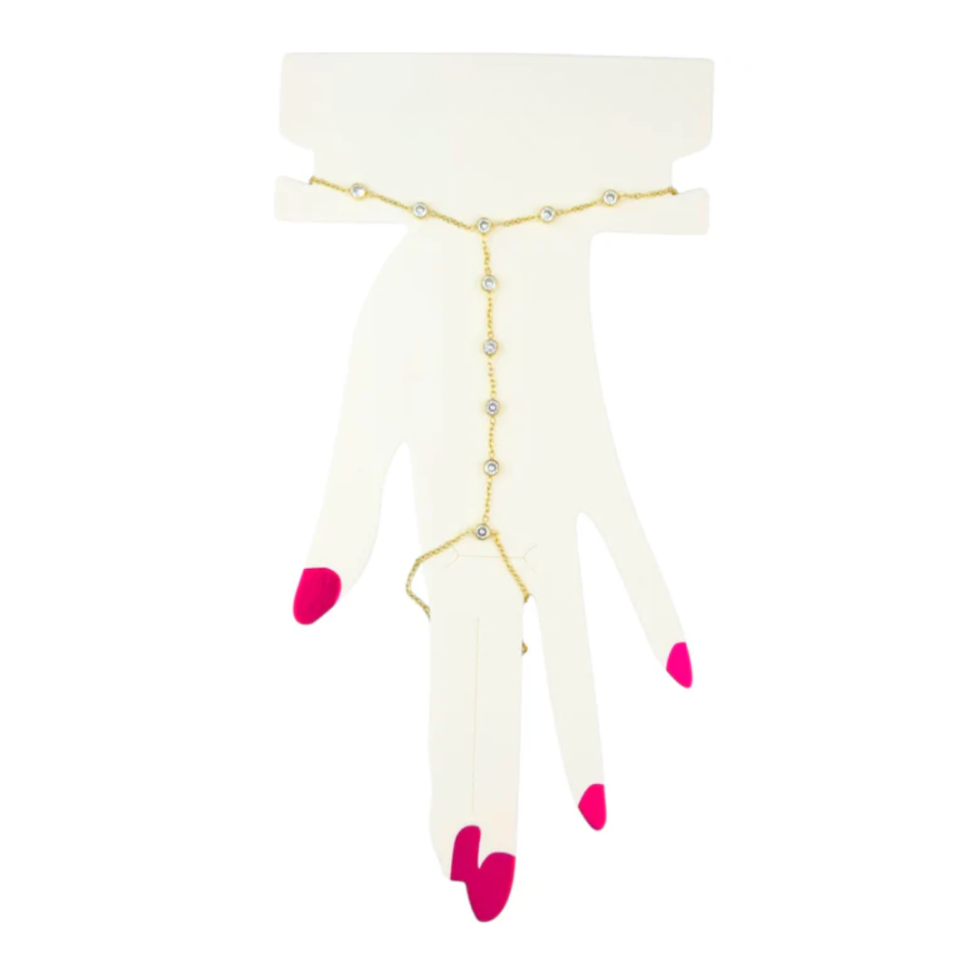 Productomschrijving: Een elegante handketting in goud met subtiele steentjes. Perfect voor een verfijnde, trendy look die meteen opvalt.Materiaal:Stainles steel & nikkelvrij